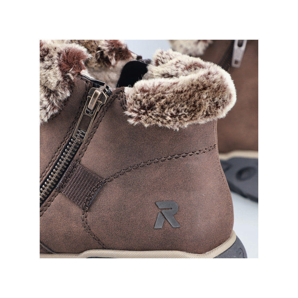 Dámske kotníkové topánky z kolekcie značky Rieker. Sú skvelým doplnením každého elegantného ale aj ležérneho outfitu. Priestorný strih, mäkký a hrejivý materiál vás zahalí do pohodlia v mrazivých dňoch. Pre všetkých, ktorí sa chcú v topánkach cítiť pohodlne a štýlovo. Pre ľahké obutie je zapracovaný funkčný zips. Pružná podošva dokonale dopĺňa dizajn, postará sa o Vaše pohodlie na každom kroku, tlmí nárazy a otrasy. Vďaka unikátnym vlastnostiam podošvy zažijete jedinečný pocit ľahkosti pri chôdzi. Ak denne trávite na nohách viac času tak značka Rieker je skutočne tou pravou voľbou pre Vás. Ide doslova o vychádzkovú obuv ktorá vydrží v plnej kvalite naozaj veľmi dlhý čas. Rieker TEX - funkčná vrstva, vďaka ktorej je topánka nepremokavá a napriek tomu priedušná.