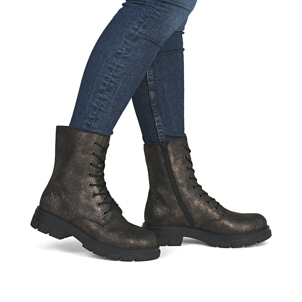 Dámske zateplené topánky, workery z kolekcie Rieker. S týmto neprehliadnuteľným kúskom skvele doplníte Váš outfit na každú príležitosť. Určite si ich zamilujete vďaka ich pohodlnosti a mäkkosti. Priestorný tvar špičky, mäkký a hrejivý materiál vás zahalí do pohodlia v mrazivých dňoch. Pre ľahké obutie je zapracovaný funkčný zips a šnúrky na šnurovanie. Vďaka pevnému šnurovaniu tento model topánok pevne priľne k nohe po celej dĺžke. Viazanie zároveň esteticky dotvára zvršok obuvi v klasickom štýle. Pre všetkých, ktorí sa chcú v topánkach cítiť pohodlne a štýlovo. Vďaka unikátnym vlastnostiam podošvy zažijete jedinečný pocit ľahkosti pri chôdzi. Ak denne trávite na nohách viac času tak značka Rieker je skutočne tou pravou voľbou pre Vás. Ide doslova o vychádzkovú obuv ktorá vydrží v plnej kvalite naozaj veľmi dlhý čas.