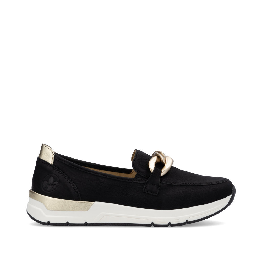 Dámske mokasíny z kolekcie značky Rieker. Jednoduché obúvanie a prispôsobenie sa podľa požiadaviek zaistia všité pružné vsadky v oblasti priehlavku. Mäkká stielka. Sú skvelým doplnením každého elegantného ale aj ležérneho outfitu. Podošva dokonale dopĺňa dizajn, postará sa o Vaše pohodlie na každom kroku, tlmí nárazy a otrasy. Vďaka jej vlastnostiam je táto obuv vyhľadávaná všetkými, ktorí musia počas dňa dlho stáť a chodiť. Ak denne trávite na nohách viac času tak značka Rieker je skutočne tou pravou voľbou pre Vás. Ide doslova o vychádzkovú obuv ktorá vydrží v plnej kvalite naozaj veľmi dlhý čas. Po vyčerpávajúcom a náročnom dni sa budú Vaše nohy cítiť svieže a oddýchnuté a to najmä vďaka ľahkým materiálom.