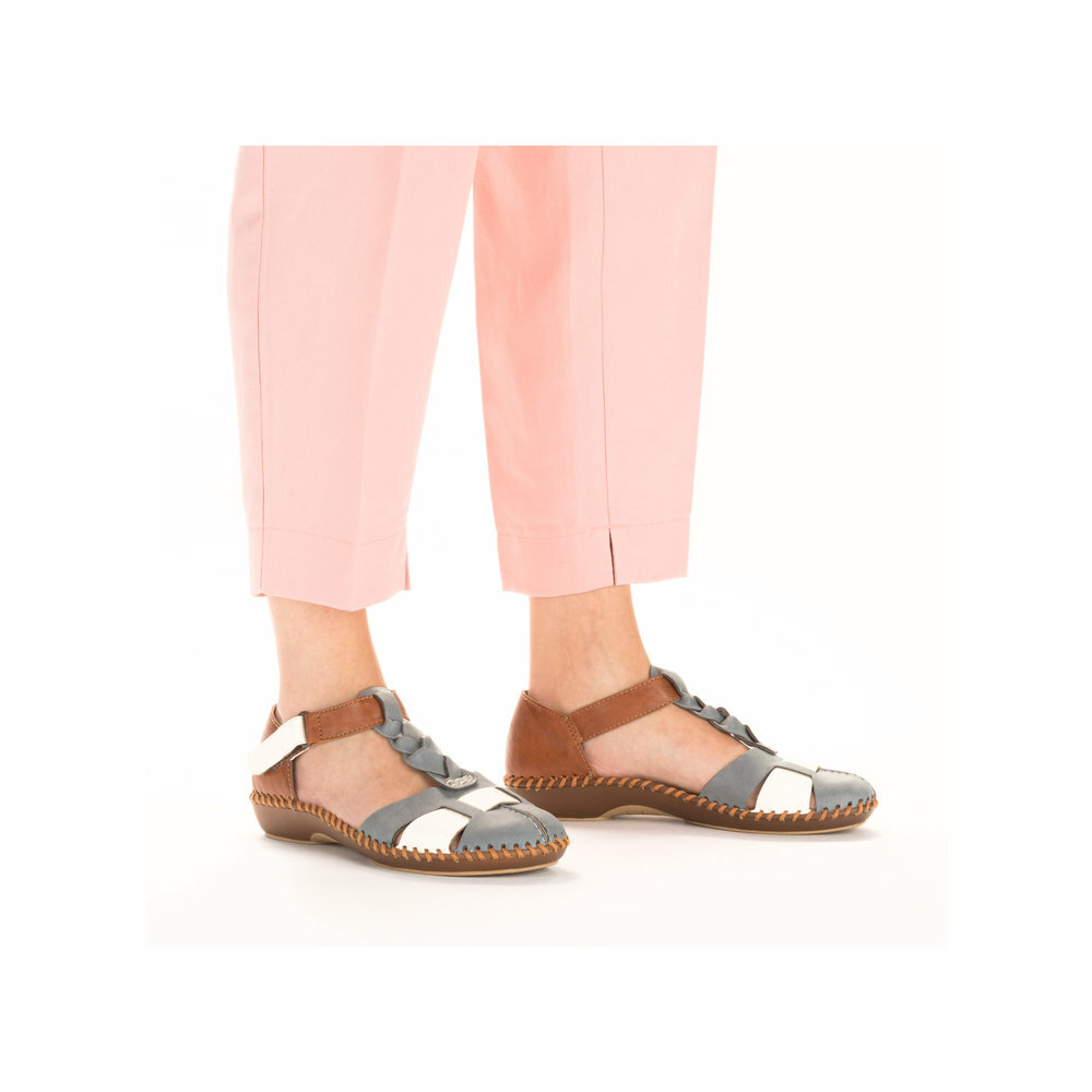 Dámske sandále z kolekcie značky Rieker na nízkom podpätku. Pohodlný strih, ktorý zaručuje pohodlie a komfort aj počas letných horúcich dní. Pre všetkých, ktorí sa chcú v topánkach cítiť pohodlne a štýlovo. S individuálne nastaviteľnými uzávermi na suchý zips poskytujú presné prispôsobenie a topánky sú tak pevné a stabilné na nohe. Ak denne trávite na nohách viac času tak značka Rieker je skutočne tou pravou voľbou pre Vás. Ide doslova o vychádzkovú obuv ktorá vydrží v plnej kvalite naozaj veľmi dlhý čas. Po vyčerpávajúcom a náročnom dni sa budú Vaše nohy cítiť svieže a oddýchnuté a to najmä vďaka ľahkým materiálom a konštrukcii.