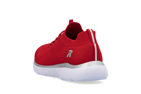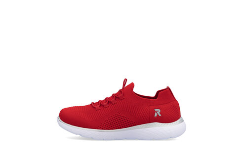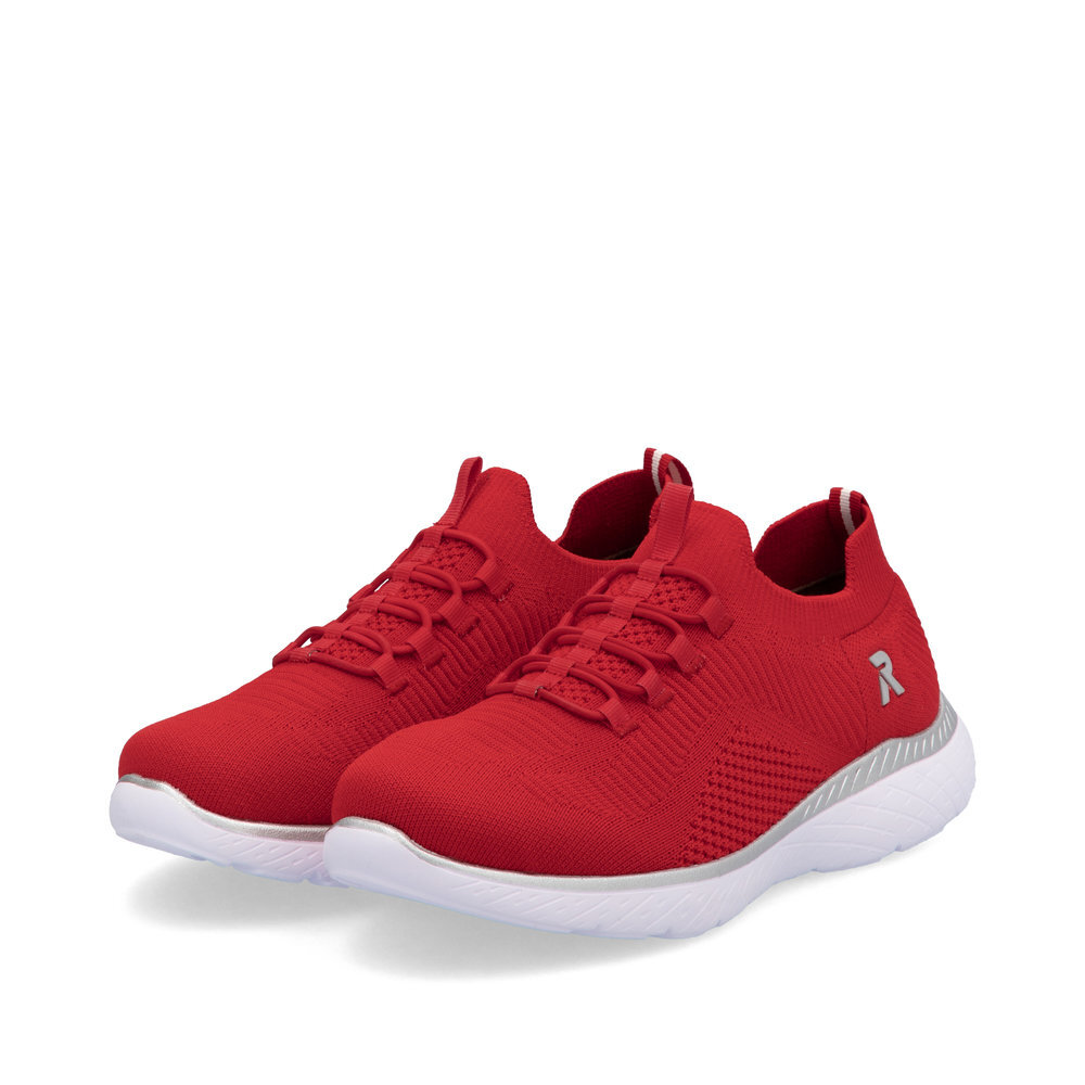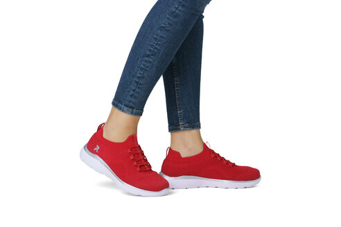 Krásne dámske červené tenisky z mäkkého a ľahkého materiálu originálne, mimoriadne funkčné z kolekcie značky Rieker - Revolution. Elastická šnúra umožňuje rýchle a jednoduché obúvanie a ultraľahká podošva poskytuje flexibilitu a efektívne tlmenie nárazov. Mäkká podrážka Memosoft vo vnútri sa prispôsobí vašim nohám a zaistí dobrú oporu počas celého dňa. Je to ideálny model, ktorý oceníte pri ceste do práce, ale aj pri bežných pochôdzkach. Vďaka unikátnym vlastnostiam podošvy zažijete jedinečný pocit ľahkosti pri chôdzi. Ak denne trávite na nohách viac času tak značka Rieker je skutočne tou pravou voľbou pre Vás. Ide doslova o vychádzkovú obuv ktorá vydrží v plnej kvalite naozaj veľmi dlhý čas. Po vyčerpávajúcom a náročnom dni sa budú Vaše nohy cítiť svieže a oddýchnuté a to najmä vďaka ľahkým materiálom a konštrukcii.