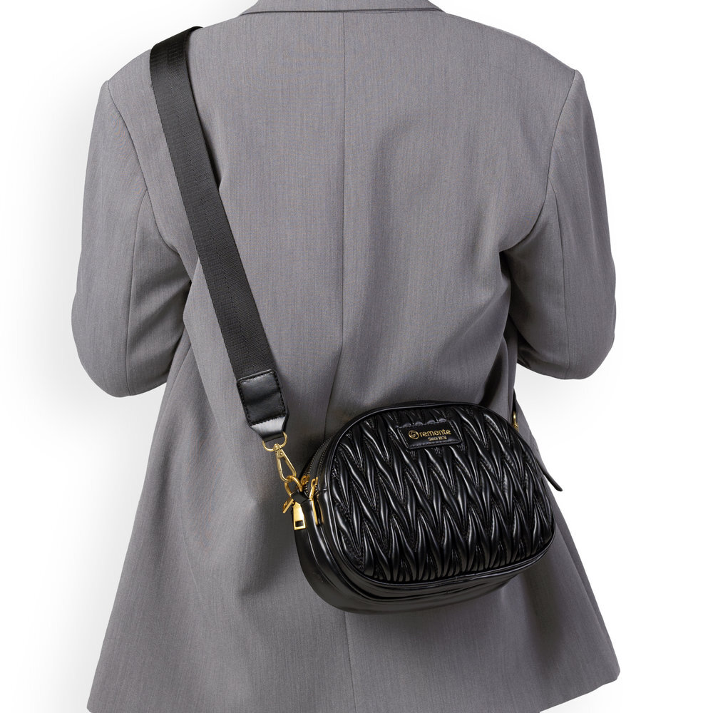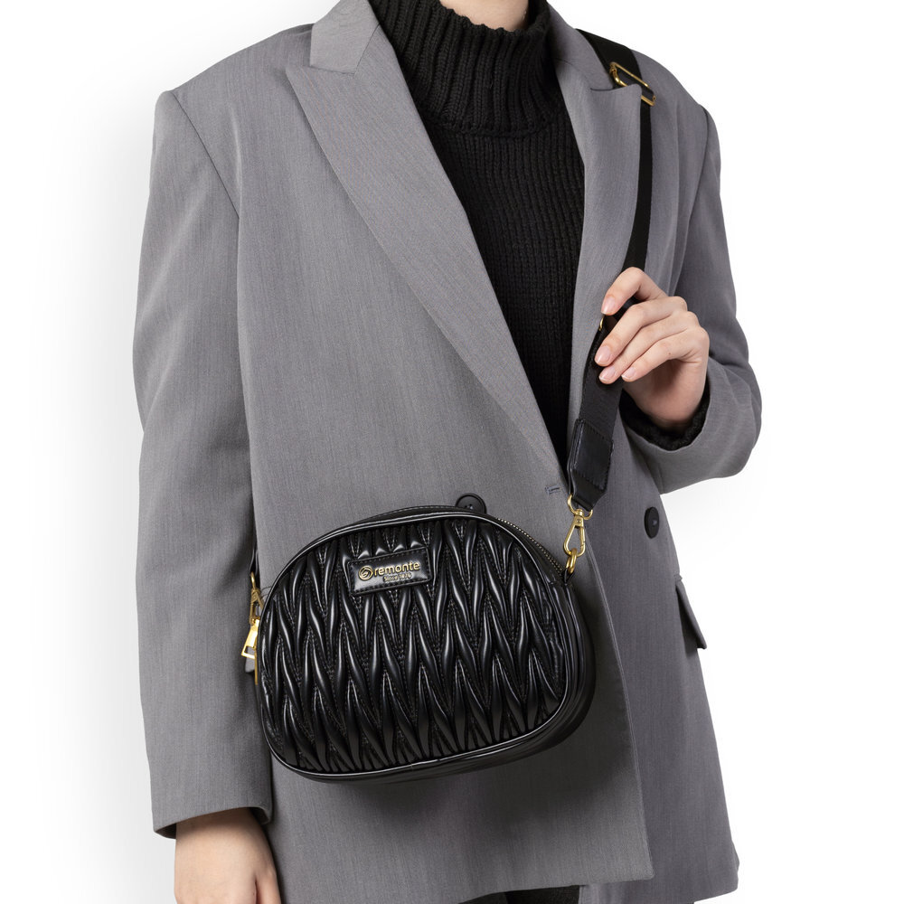 Dámska crossbody kabelka z kolekcie značky Remonte - Rieker. Jedinečný dizajn, ktorý dotvára čierny zvršok ozdobený efektným riasením a štýlovou nášivkou s logom značky. Vnútorný priestor je prakticky rozdelený do troch samostatných častí, každá so zapínaním na zips, pričom dve z nich sú doplnené o menšie kapsičky na drobnosti. Zadná strana ponúka ďalšie vrecko na zips, ideálne pre rýchly prístup k nevyhnutnostiam. Kabelka prichádza s dvoma odopínateľnými a dĺžkovo nastaviteľnými popruhmi – klasickým čiernym a druhým s výrazným vzorom, vďaka čomu si ju môžete prispôsobiť podľa svojho štýlu a príležitosti. Ideálna voľba pre každodenné nosenie aj výnimočné príležitosti – táto kabelka ponúka dokonalú rovnováhu medzi štýlom a funkčnosťou. Rozmery cca V 18 cm x Š 22 cm x H 8 cm, kabelka je delená, má dĺžkovo nastaviteľné popruh, ktorý je možné odopnúť. Maximálna dĺžka nastaviteľného popruhu je cca 125 cm.