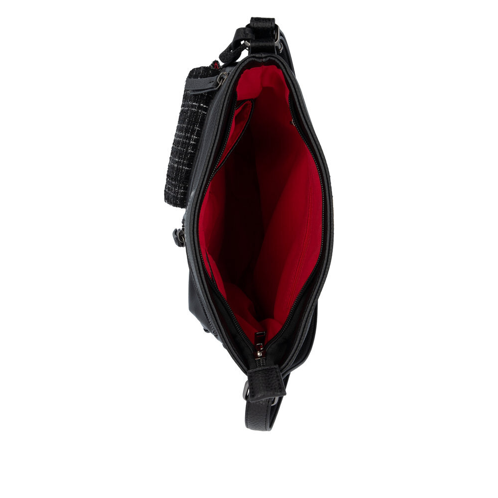 Táto dámska kabelka z kolekcie Remonte - Rieker je stelesnením štýlového vzhľadu a funkčnosti v jednom. Kombinácia Matt Black, lesklé akcenty a textilný materiál so vzorom vytvára originálny dizajn. Praktické predné vrecká - väčšie so zipsom, menšie so zipsom a druhé uzavreté s magnetickou sponou - umožňujú rýchly prístup k malým predmetom a je tu aj zadné vrecko na zips. Hlavným priestorom je zips a ponúka ďalšie menšie priehradky vo vnútri, ktoré pomáhajú udržiavať veci jasne usporiadané. Určite oceníte malú peňaženku ako praktické príslušenstvo - ideálne pre malé mince, kľúče alebo iné malé veci, ktoré potrebujete mať po ruke. Vďaka karabíne ju môžete jednoducho pripevniť k kabelke. Rozmery cca 29 cm x W 26 cm x H 5 cm, kabelka nie je rozdelená, má dĺžkový remienok. Kabelka má dĺžkovo nastaviteľný popruh, ktorý nemožno odopnúť. Maximálna dĺžka nastaviteľného popruhu je cca 125 cm.