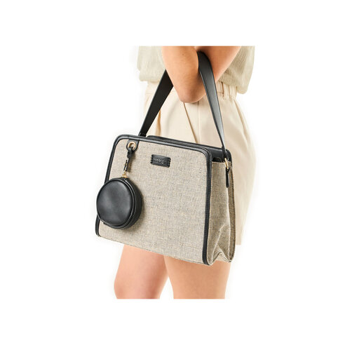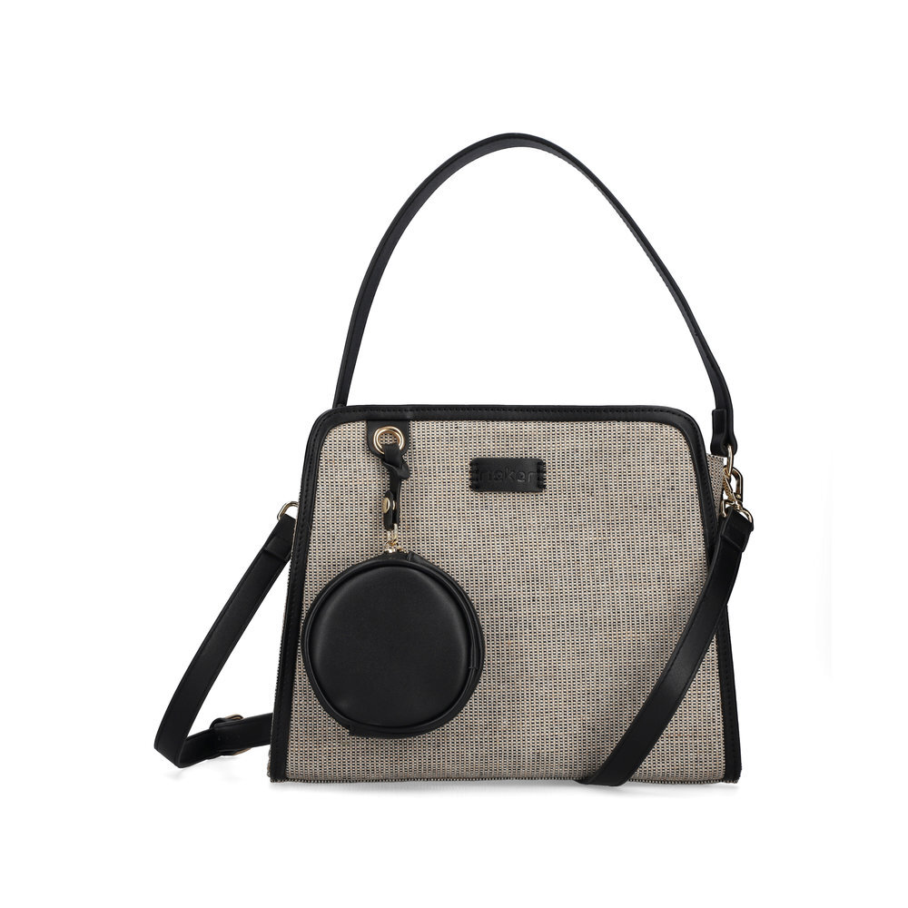 Táto krásna elegantná dámska kabelka z kolekcie značky Rieker je dokonalým doplnkom na každodenné nosenie. Zaujímavý materiál vrchnej časti dodáva kabelke jedinečný vzhľad, ktorý je podčiarknutý štýlovou nášivkou s logom značky. Originálnym a praktickým prvkom je malé puzdro umiestnené na prednej strane, ktoré pridáva na exkluzivite. Vrchný zips bezpečne chráni vaše veci, zatiaľ čo menšie bočné vrecká poskytujú dostatok priestoru pre drobnosti. Pevný kratší úchyt umožňuje pohodlné nosenie cez rameno, a pokiaľ preferujete variabilitu, môžete pripnúť dĺžkovo nastaviteľný popruh pre maximálny komfort. Štýl a praktickosť v jednom – ideálna kabelka na každý deň. Rozmery cca V 24 cm x Š 29 cm x H 11 cm. Vnútorné usporiadanie, kabelka nie je delená. Kabelka má dĺžkovo nastaviteľný popruh, ktorý nie je možné odopnúť.