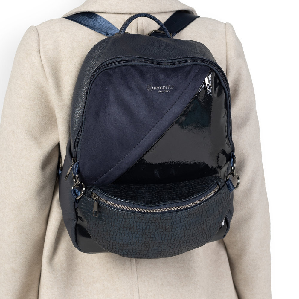 Originálny dámsky batoh z kolekcie značky Remonte by Rieker. S prehľadom sa Vám do neho zmestia každodenné potreby. Stredná veľkosť - do batohu sa zmestí formát A4, kovanie vo farbe ocele. Na prednej strane šikmé zipsové vrecko a odopínateľná ľadvinka, na zadnej strane zipsové vrecko a pútko na cestovný kufor, na bokoch malé otvorené vrecká, zhora zipsový uzáver. Vnútorná výbava 1x zipsové vrecko na cennosti, 2x otvorené vrecko na mobil, kľúče a pod. Spevnené dno, látkové ramenné popruhy s dĺžkovou reguláciou, odopínateľný ramenný/crossbody popruh s dĺžkovou reguláciou 75-135 cm, pútko do ruky alebo na zavesenie. Rozmery cca stredná šírka 26 cm, výška 35 cm, dno má hĺbku 12,5 cm.