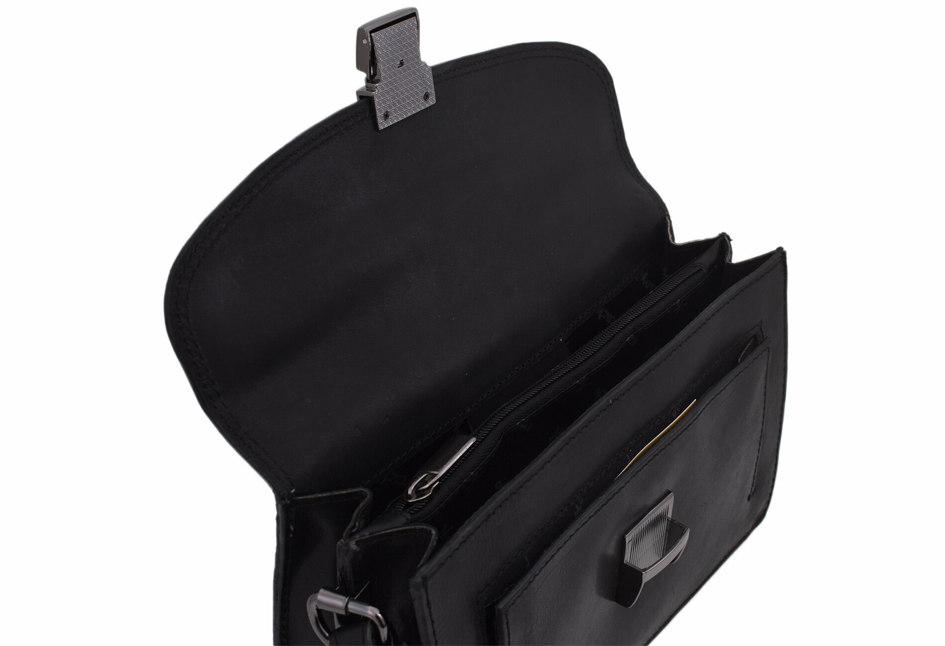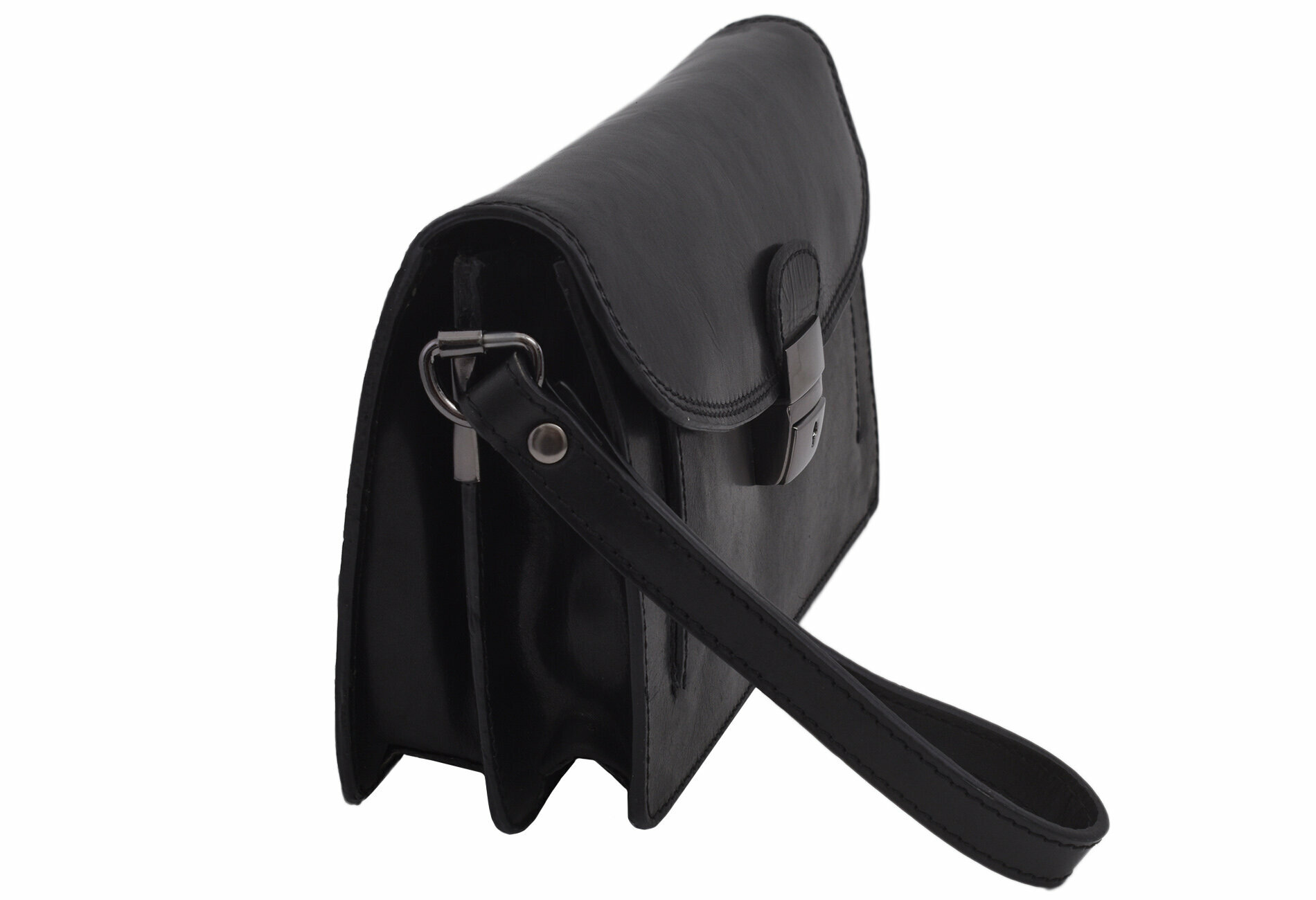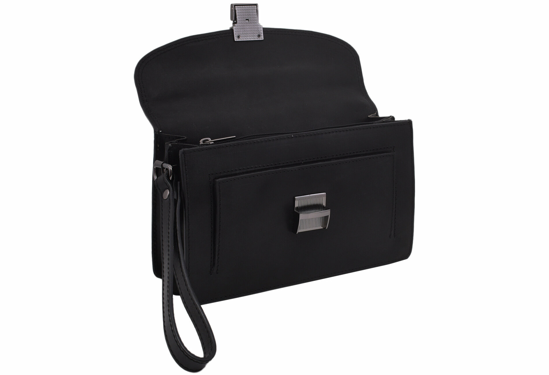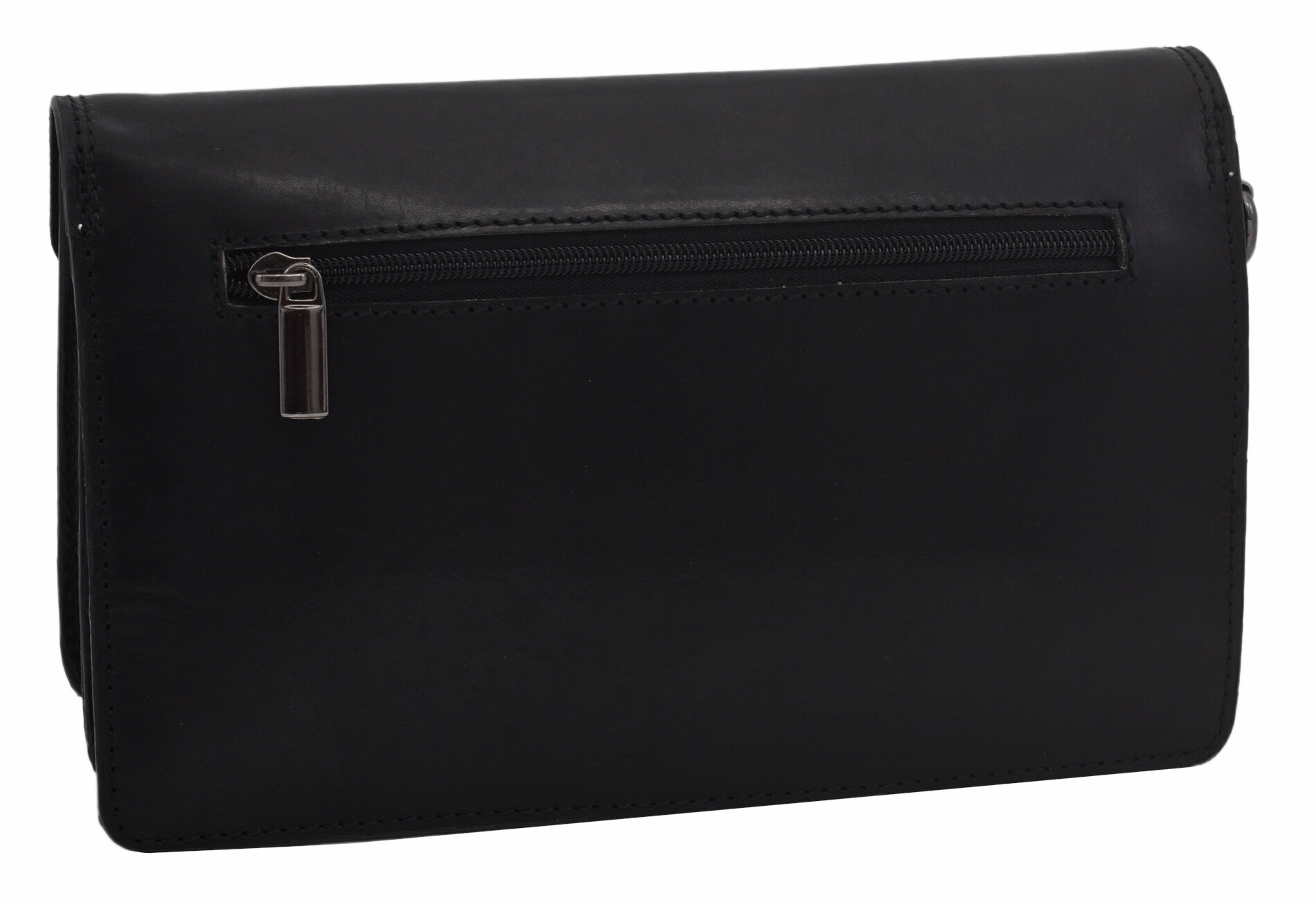 Kožená taška etue s priestranným vnútrom. Vnútorné členenie: - 2 oddelené priestory - 1 rozdeľujúca úzka priehradka so zipsom - 1 otvorená priehradka na prednej strane - 1 zipsová prepážka na zadnej strane tašky - pevný popruh - šírka 1,5 cm Maximálne zaťaženie 1 kg Rozmery: v 14,5 x š 23,5 x h max 8,5 cm