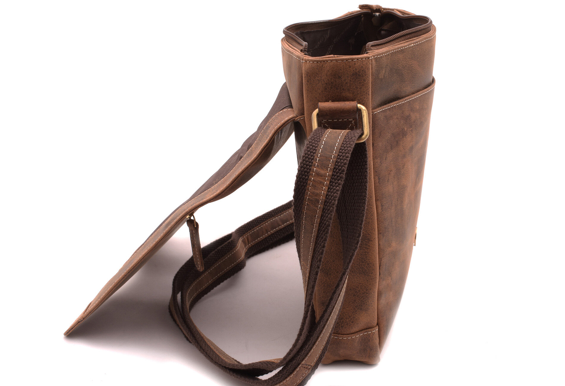 Štýlová kožená taška na rameno s priehradkami na zips. Vyrobená z kože v prírodnej úprave. Taška má nastaviteľnú veľkosť ucha. Vo vnútri tašky je malé podšívkové vrecko na zips a kapsičky na mobil a perá. Tašku prekrýva preklop a uzatvára magnet. Použité sú kvalitné YKK kovové zipsy. Vnútorné členenie: - 1 komora na zips - 1 zipsová priehradka na klope - 1 otvorená priehradka vpredu - 2 otvorené podšívkové vrecká - popruh na rameno - šírka 3,5 cm - dĺžka popruhu 150cm Maximálne zaťaženie 1 kg