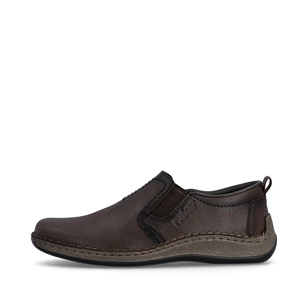 Pánske kožené mokasíny z kolekcie značky Rieker. Priestorný strih. Sú vybavené vsadenými gumičkami pre pohodlné vyzúvanie a obúvanie. Pohodlná, ľahká konštrukcia s mäkkou stielkou zaistí príjemnú chôdzu, rovnako ako aj ohybná podošva. Vďaka jej vlastnostiam je táto obuv vyhľadávaná všetkými, ktorí musia počas dňa dlho stáť a chodiť. Kožené topánky sú zaručenou klasikou, zaručia Vám vysokú kvalitu a ide o pár, ktorý vám vydrží niekoľko sezón. Pružná podošva dokonale dopĺňa športový dizajn, postará sa o Vaše pohodlie na každom kroku, tlmí nárazy a otrasy. Ak denne trávite na nohách viac času tak značka Rieker je skutočne tou pravou voľbou pre Vás. Ide doslova o vychádzkovú obuv ktorá vydrží v plnej kvalite naozaj veľmi dlhý čas. Po vyčerpávajúcom a náročnom dni sa budú Vaše nohy cítiť svieže a oddýchnuté a to najmä vďaka ľahkým materiálom.