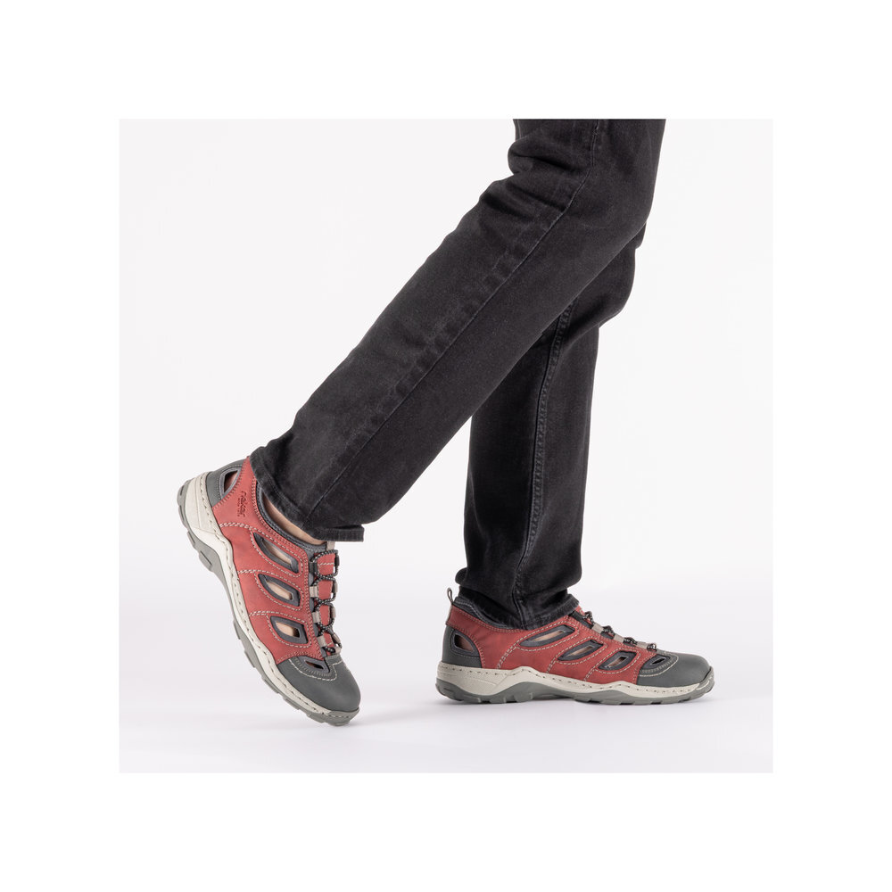 Pánske športové sandále z kolekcie značky Rieker. Dizajnová podošva sa postará o Vaše pohodlie na každom kroku. Tento model oceníte pri ceste do práce, ale aj pri bežných pochôdzkach. Pružná podošva dokonale dopĺňa športový dizajn, postará sa o Vaše pohodlie na každom kroku, tlmí nárazy a otrasy. Vďaka jej vlastnostiam je táto obuv vyhľadávaná všetkými, ktorí musia počas dňa dlho stáť a chodiť. Ak denne trávite na nohách viac času tak značka Rieker je skutočne tou pravou voľbou pre Vás. Ide doslova o vychádzkovú obuv ktorá vydrží v plnej kvalite naozaj veľmi dlhý čas. Po vyčerpávajúcom a náročnom dni sa budú Vaše nohy cítiť svieže a oddýchnuté a to najmä vďaka ľahkým materiálom.