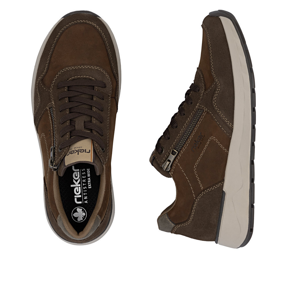 Pánske kožené topánky športového štýlu, tenisky z kolekcie značky Rieker. Pohodlný strih. Tento model oceníte pri ceste do práce, ale aj pri bežných pochôdzkach. Bočné zapínanie na zips pre jednoduché obutie a šnurovaním pre jednoduché správne nastavenie potrebnej šírky. Kožené topánky sú zaručenou klasikou, zaručia Vám vysokú kvalitu a ide o pár, ktorý vám vydrží niekoľko sezón. Pre všetkých, ktorí sa chcú v topánkach cítiť pohodlne a štýlovo. Pružná podošva dokonale dopĺňa dizajn, postará sa o Vaše pohodlie na každom kroku, tlmí nárazy a otrasy. Vďaka unikátnym vlastnostiam podošvy zažijete jedinečný pocit ľahkosti pri chôdzi. Ak denne trávite na nohách viac času tak značka Rieker je skutočne tou pravou voľbou pre Vás. Ide doslova o vychádzkovú obuv ktorá vydrží v plnej kvalite naozaj veľmi dlhý čas. Po vyčerpávajúcom a náročnom dni sa budú Vaše nohy cítiť svieže a oddýchnuté a to najmä vďaka ľahkým materiálom a konštrukcii.